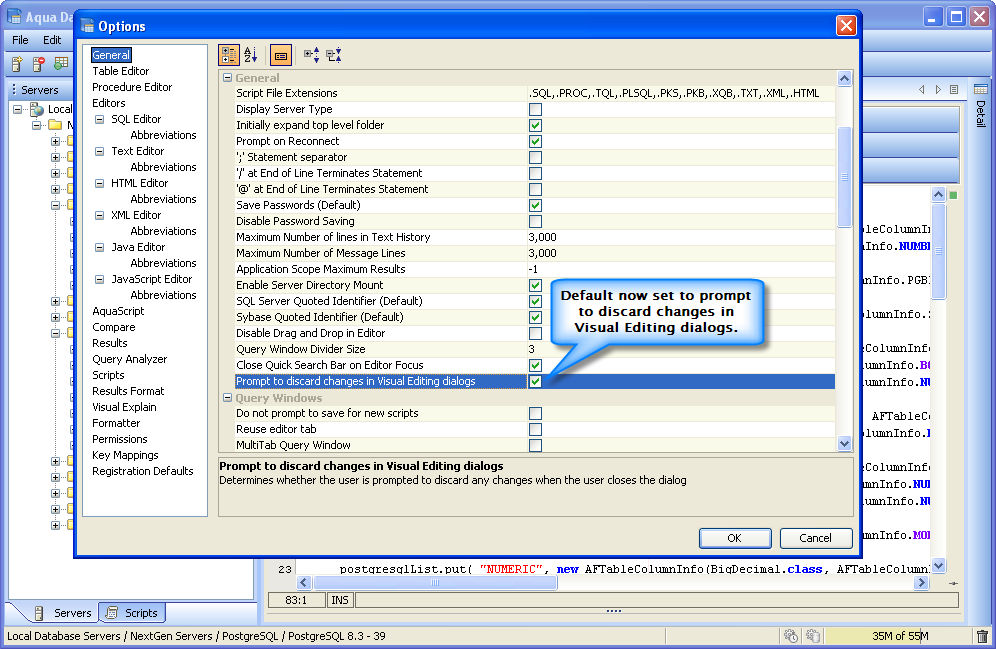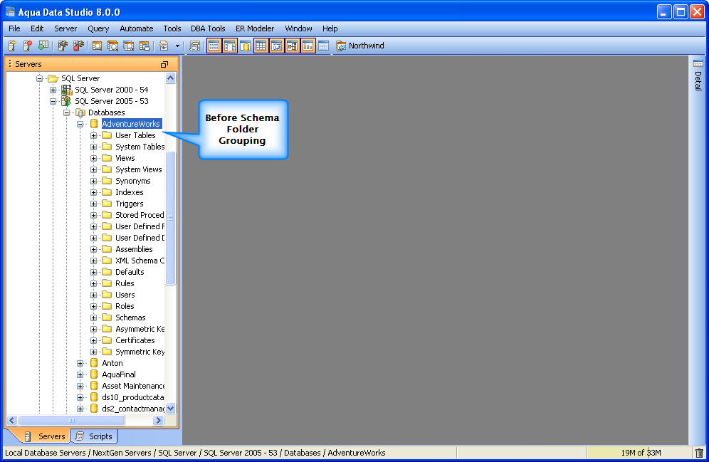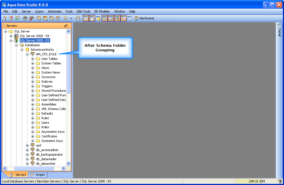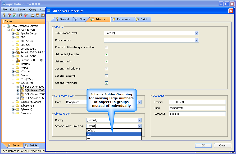 Schema Folder Grouping: In the Advanced Server Registration tab there is an option called "Use Schema Folder Grouping" with possible options of Default, Yes and No. It applies to all vendors that have "database" node in the schema browser but no schema node to group schema objects : MS SQL Server, Sybase ASE, Sybase Anywhere, Sybase IQ, Informix, nCluster, PostgreSQL. When displaying hundreds of tables, or thousands of tables, Schema Folder Grouping makes finding tables much easier because it groups them instead of showing each object individually.