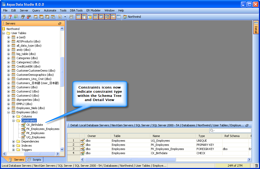Icons for Constraint Types: Constraints in the schema browser now have icons specific to the type so you can quickly identify the types of constraints on a table.