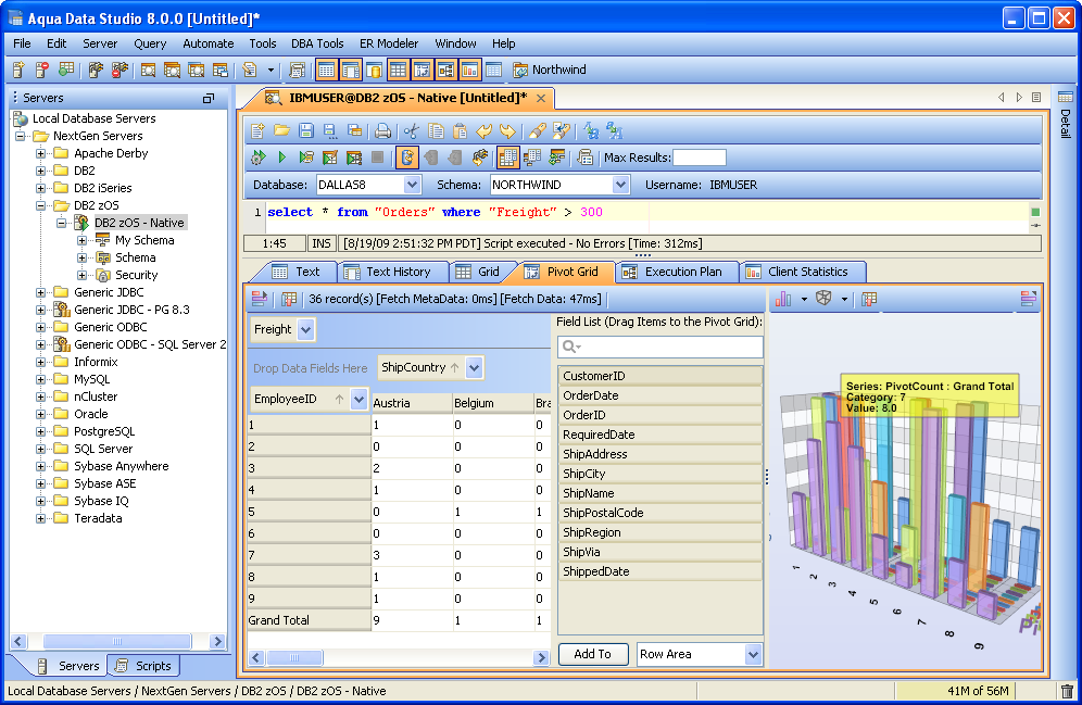 - Query Analyzer - Auto Completion, Syntax Coloring, Grid Results, Pivot Grid Results and Charting toolkit. Saving results to CSV, INSERT statements, XML, HTML and Excel worksheets.