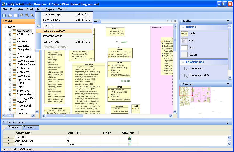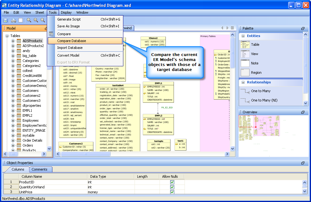 Compare to Database : Users can compare the schema objects of the current model to the schema objects of a target database.