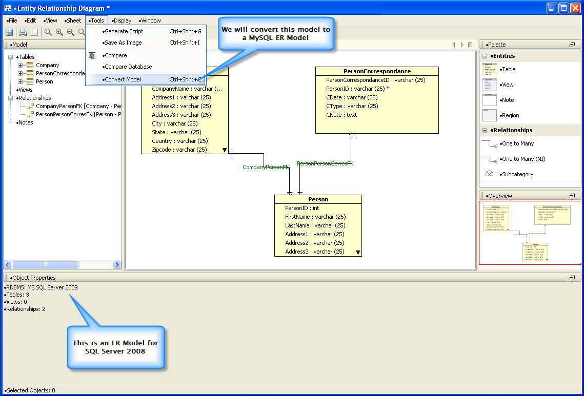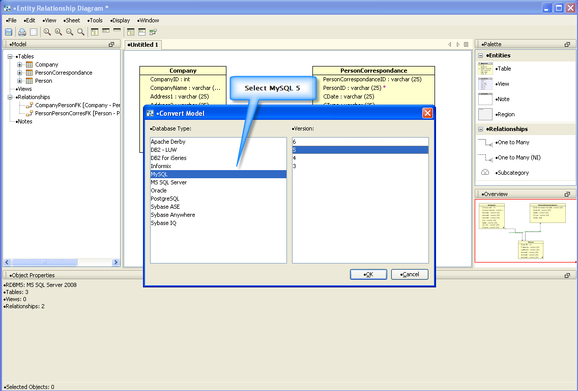 Convert ER Models from one database to another: The ER Modeler now has the option to convert a model from one database vendor to another, by using the menu Tools->Convert. A user may reverse engineer a database from Microsoft SQL Server into an ER Model, convert the model to MySQL and then generate the DDL for MySQL to create a new database. The model conversion works with any database type as the source and/or target, essentially allowing the user to migrate from and to any database.