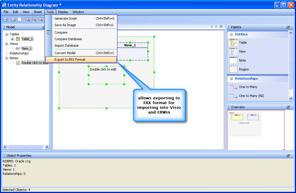 Export to ERX : The ER Modeler now allows exporting to ERX format for importing into Visio and ERWin.