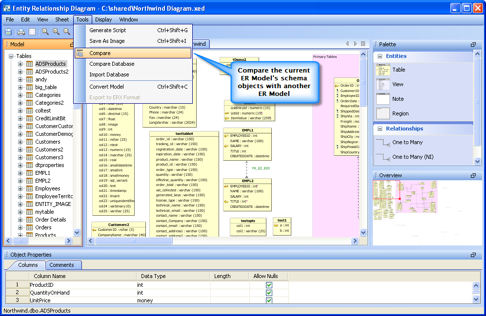Compare to ER Model : The ER Modeler now allows users to compare the schema objects of the current model to the schema objects of another model.