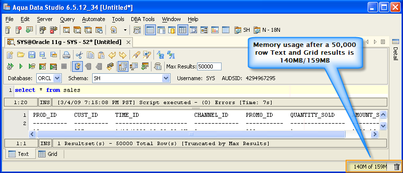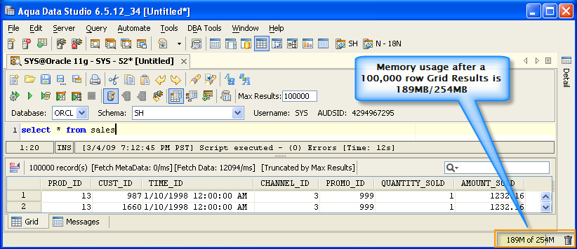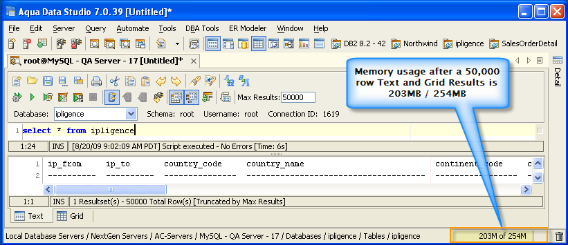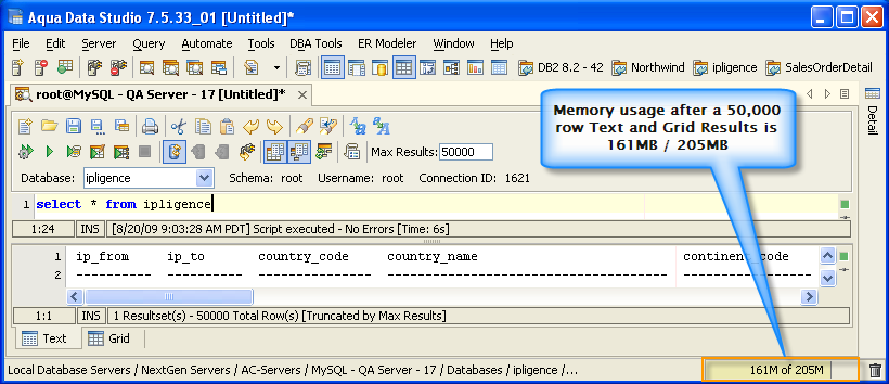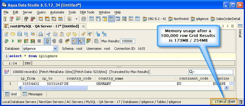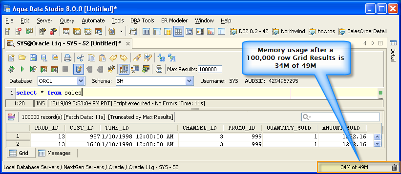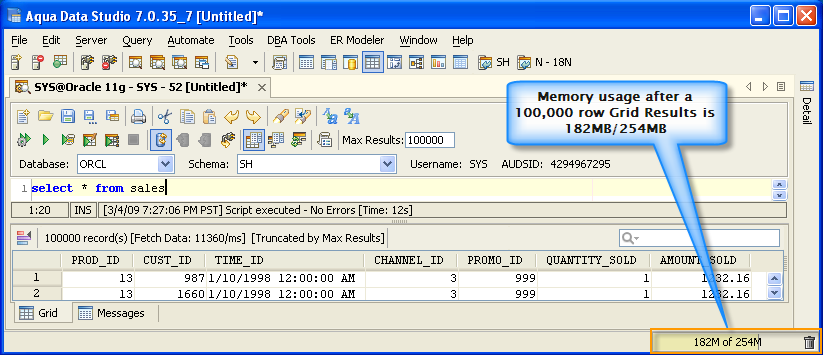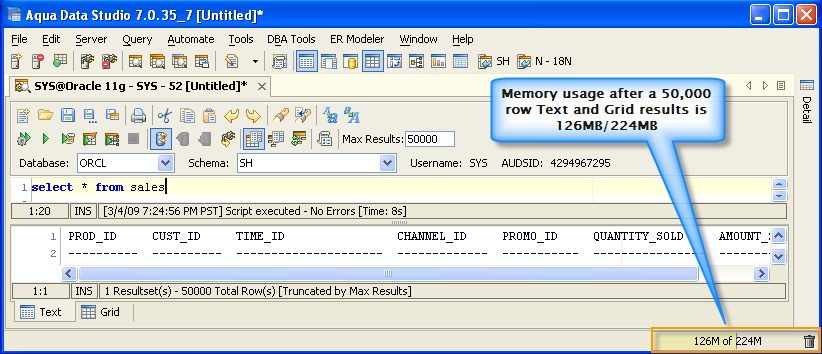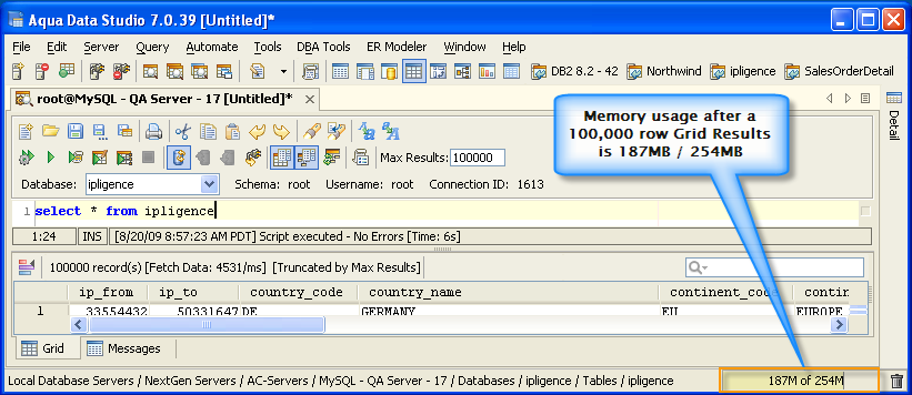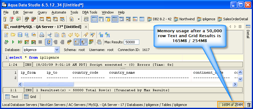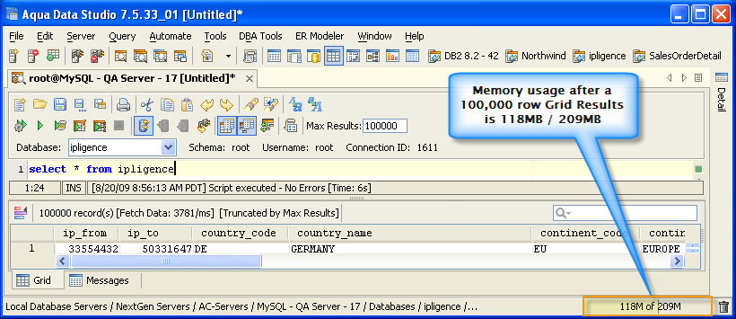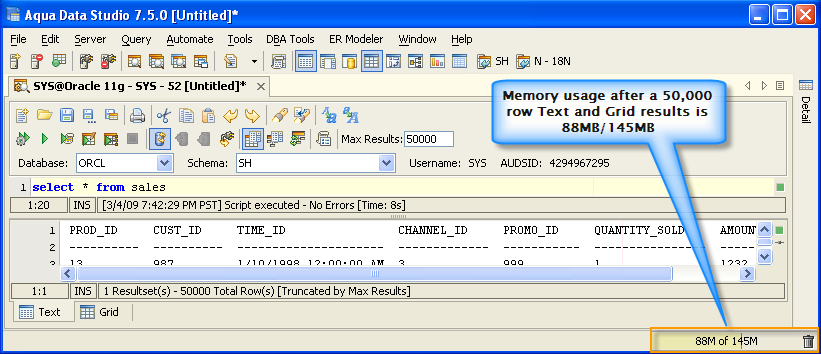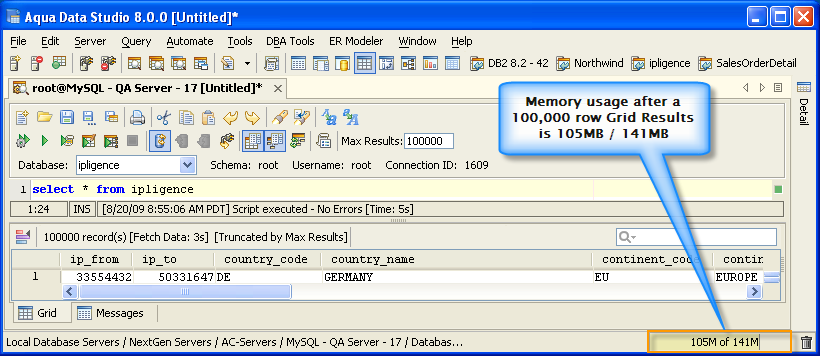 Version 8.0 of Aqua Data Studio now includes improved memory optimization methods than previous versions. One of these techniques is a memory compression method for optimizing resultsets which includes redundant data such as numeric data. Querying for large results in data warehousing environments with large quantities of numeric data will yield dramatic memory reductions. Long term use of Aqua Data Studio in these environments will keep memory usage low and in turn keep performance of the application high. The optimizations are most apparent in the Query Analyzer, Query Builder, Saving Results and Exporting of data.