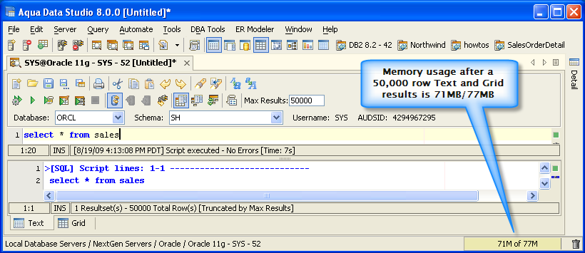 Version 8.0 uses less memory than its predecessors on queries with large resultsets of "redundant" data in the Text and Grid results. Older versions require 24% | 97% more memory.