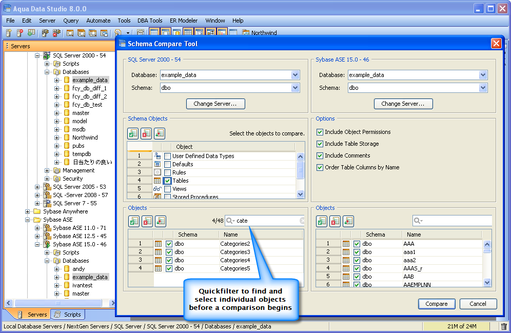 Select Objects for Comparison: Schema Compare tool now has Quick filter. You can filter and select the individual objects to compare before the full schema compare begins.