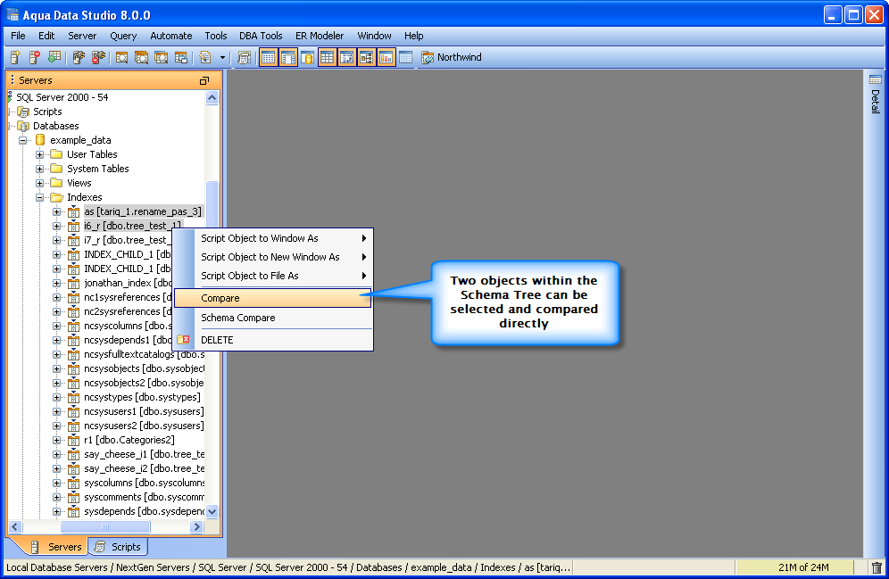 CREATE DDL for Comparisons: From the Schema Tree, you can select any two database objects and compare them. This will generate the CREATE DDL for each and provide the differences between the two.